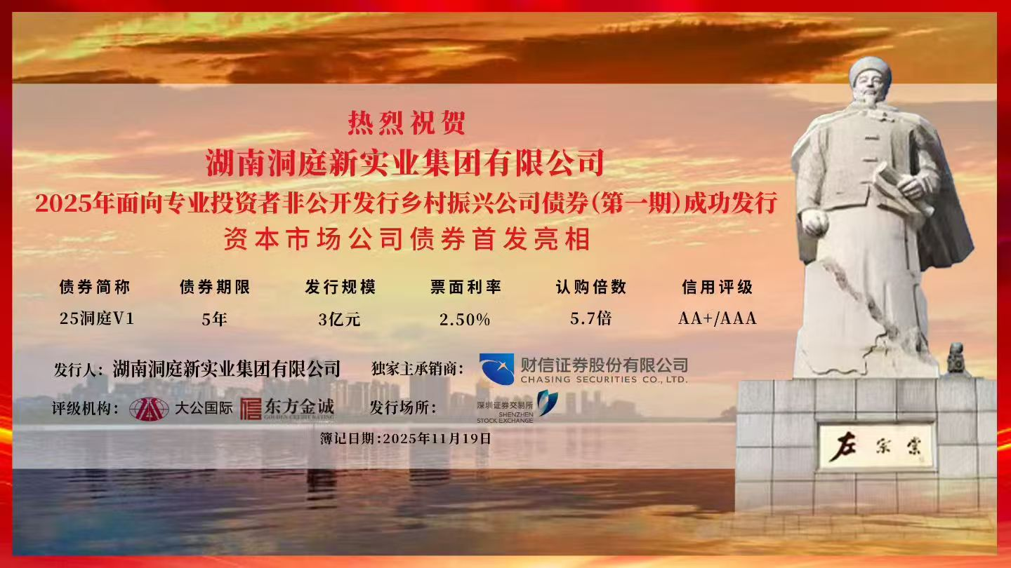 11月19日,湖南洞庭新实业集团有限公司资本市场公司债首发亮相,面向专业投资者非公开发行的3亿元人民币乡村振兴公司债券(第一期)成功发行,本期债券期限5年,发行利率2.5%,由财信证券独家主承销,主体和债项评级由大公国际、东方金诚评定为AA+/AAA。发行当日,公司债券通过深圳证券交易所进行簿记建档并挂网销售,吸引了银行、证券公司、基金公司等大量投资机构广泛参与和踊跃认购,全场认购倍数达5.7倍,总认购金额达17.1亿元,充分反映了公司在资本市场的吸引力和影响力,以及市场对公司发展前景的高度认可和坚定信心。